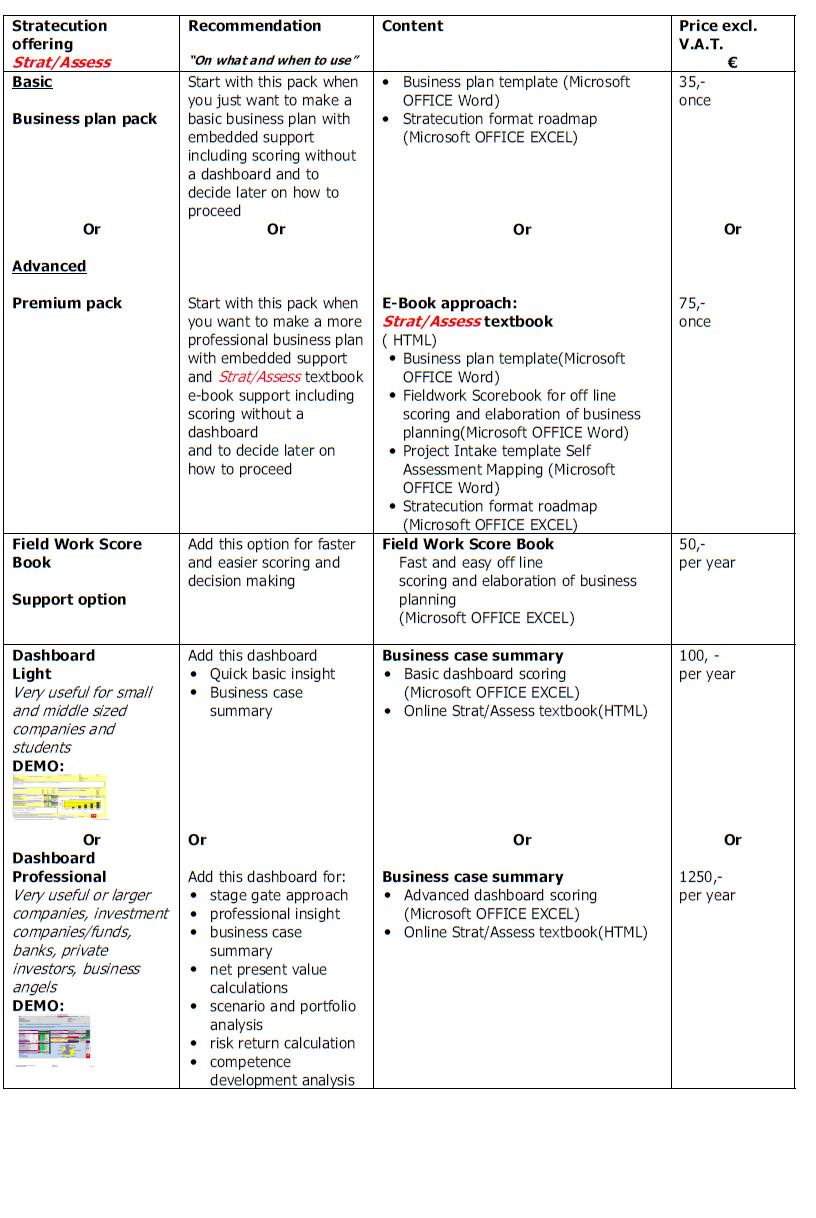 - To start: "Business plan pack" € 35,- once excl. VAT including a.o. business plan template or the comprehensive "Premium pack" € 75,- once excl. VAT
